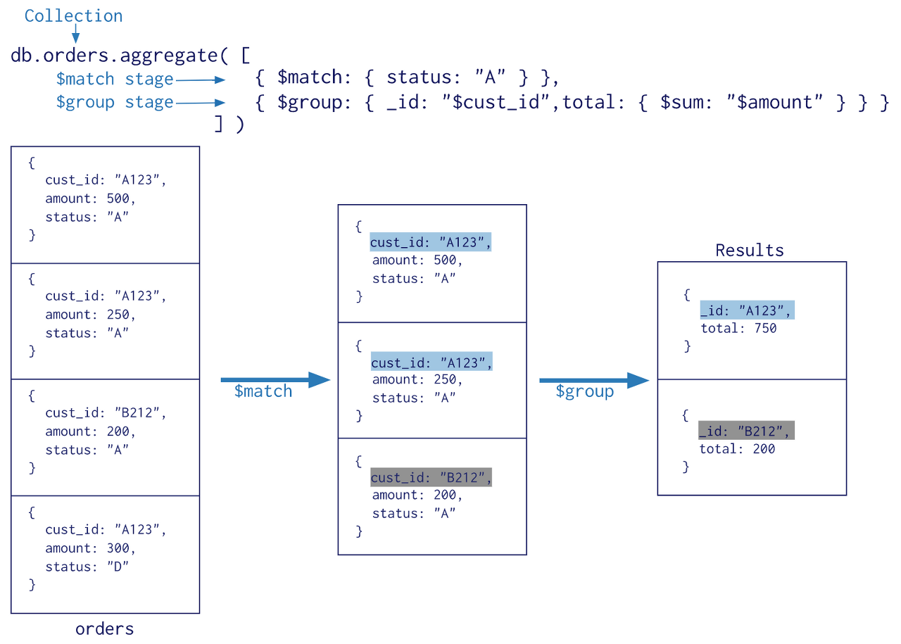 2)$match의 출력은 $group 연산자로 전달되며, $group 연산자는 출력을 특정 키로 그룹화하여 합계 및 평균과 같은 새로운 정보를 제공한다.