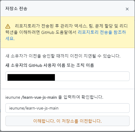 저장소 이전에 대한 정보를 읽은 다음 저장소 소유권을 이전할 사용자 또는 조직의 이름을 입력한다.