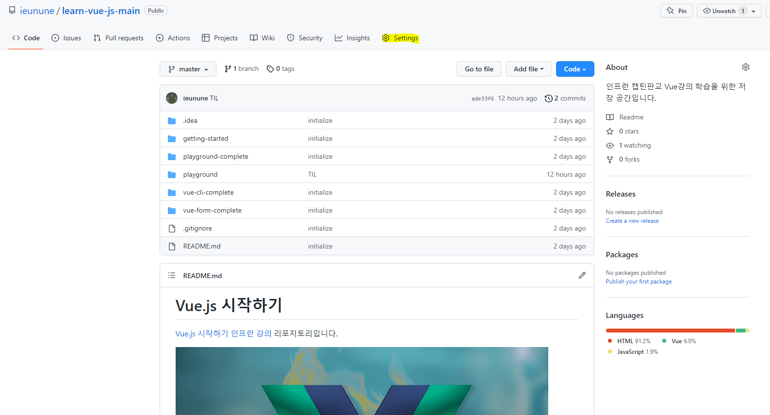 GitHub.com에서 리포지토리의 기본 페이지로 이동 후 ⚙️Settings에 접근한다.